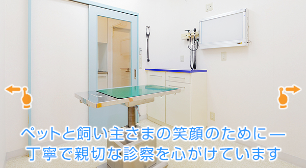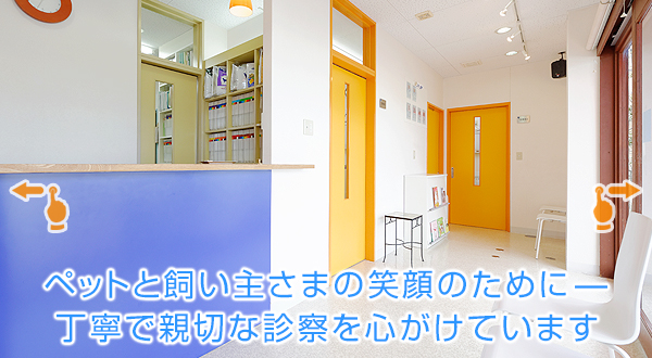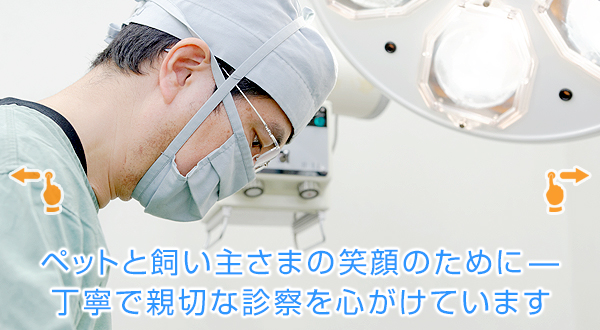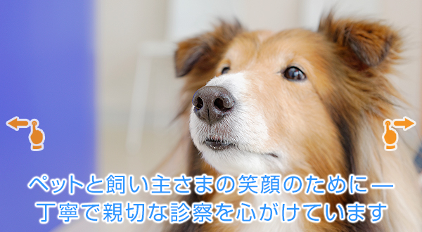 私たちは、それぞれの事情を考慮して、ペットにとって一番良い治療は何かということを飼い主さまと一緒に考えていきたいと思っています。 病院として、スタッフと共に、誠実、正直に、 命に対して真摯に向き合うことを心がけています。
